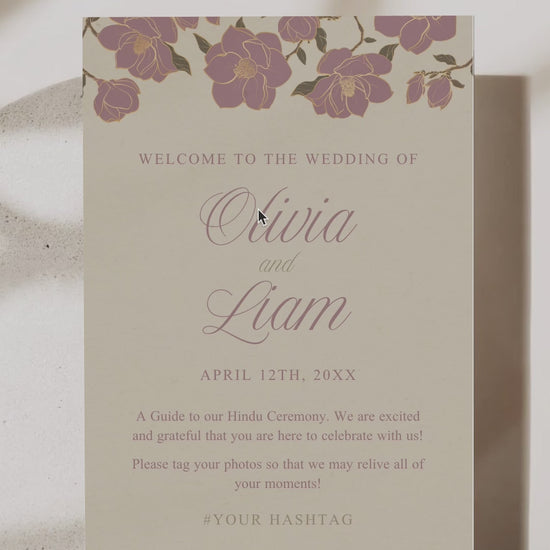 Are you planning a wedding and want to add your own personal touch? Our stationery designs are perfect for the DIY enthusiast. This mauve floral wedding program card is designed to add a fun element for your event. This design is created for a hindu wedding ceremony, however all of the content can be changed to align to any ceremony. Although the background floral artwork is not editable (due to artist copyright) the text & background color can be customized to your preference. Save time and money without compromising on quality or style by bundling your stationery.