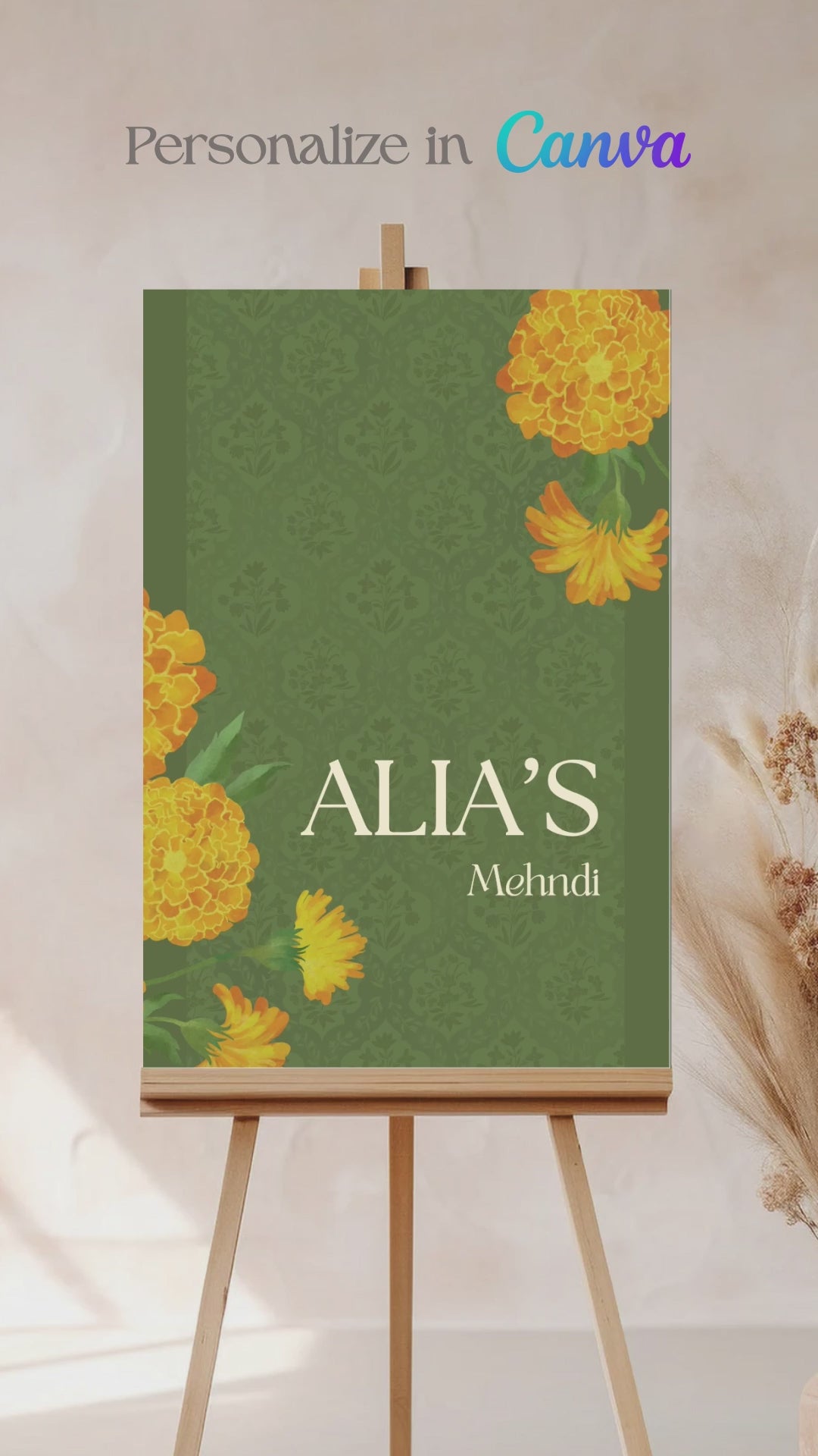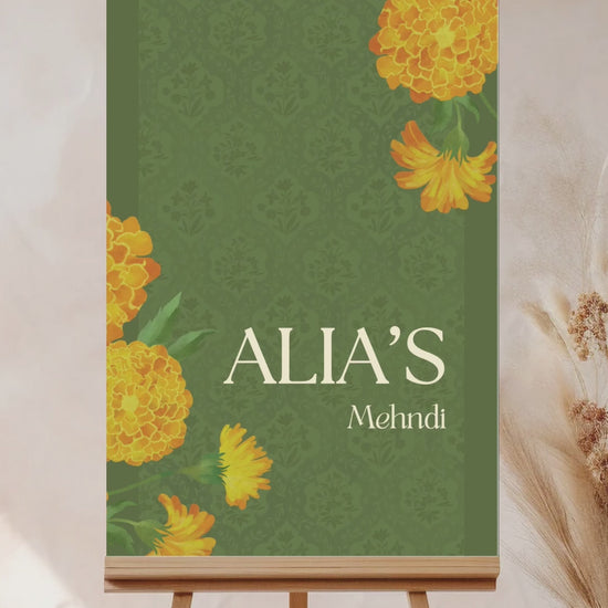 Are you planning a wedding event and want to add your own personal touch? Our stationery designs are perfect for the DIY enthusiast. This mehndi green design with yellow & orange marigold floral welcome sign is the perfect fit for any type of event or theme. Although the background artwork cannot be edited, due to artist Copyright, all text (and its colours) can be customized to your preference. Save time and money without compromising on quality or style by bundling your stationery.