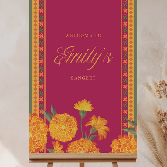 Are you planning a wedding event and want to add your own personal touch? Our stationery designs are perfect for the DIY enthusiast. This marigold floral welcome sign is the perfect fit for any type of event or theme. Although the background artwork cannot be edited, due to artist Copyright, all text (and its colours) can be customized to your preference. Save time and money without compromising on quality or style by bundling your stationery.