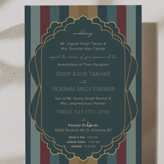 Are you planning a wedding event and want to add your own personal touch? Our stationery designs are perfect for the DIY enthusiast. This modern striped invitation set is the perfect fit for any type of event. The colours and design are inspired by Sabyasachi's wallpaper prints. Although the background artwork cannot be edited, due to artist Copyright, all text (and its colours) can be customized to your preference. Save time and money without compromising on quality or style by bundling your stationery.