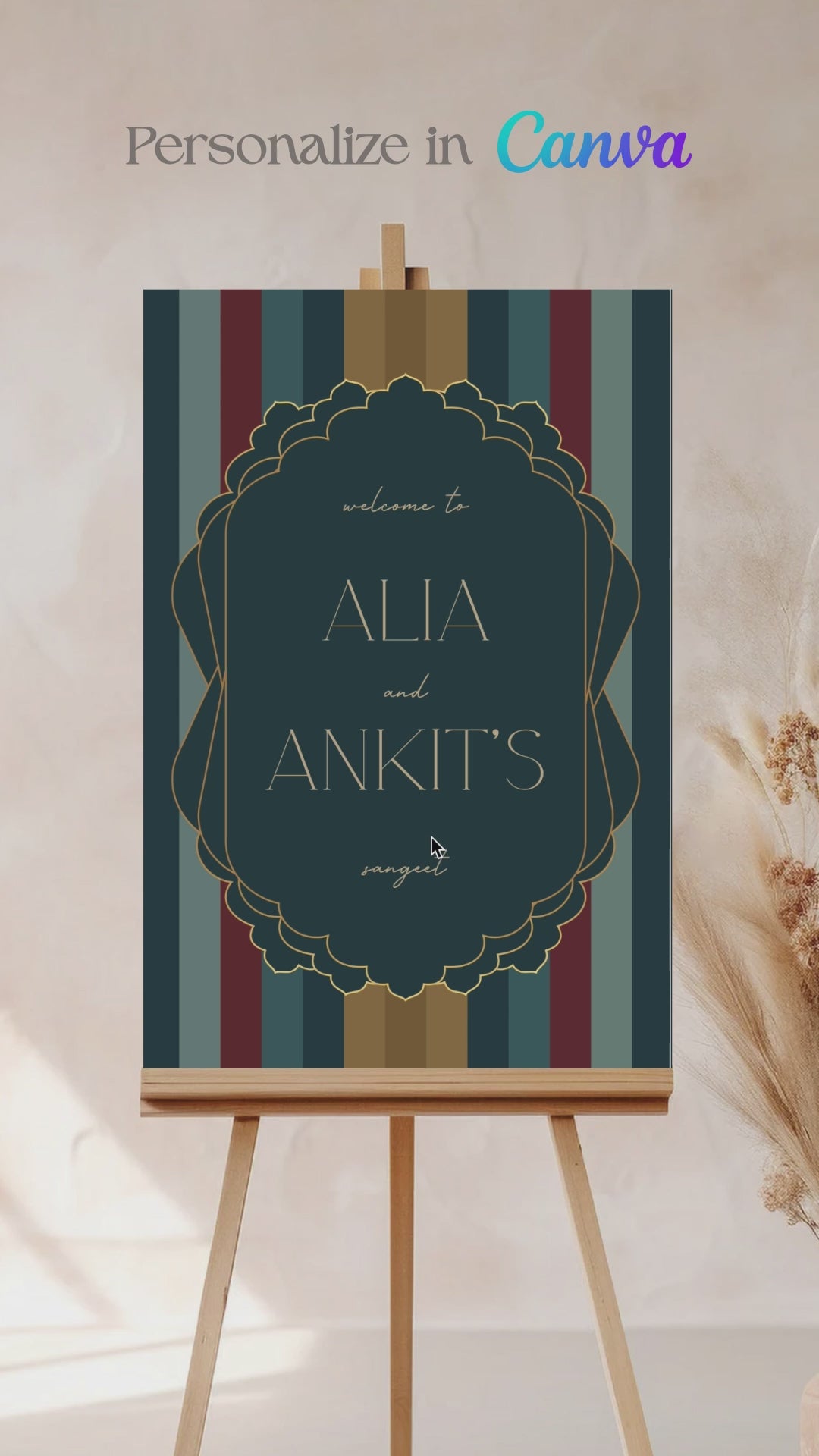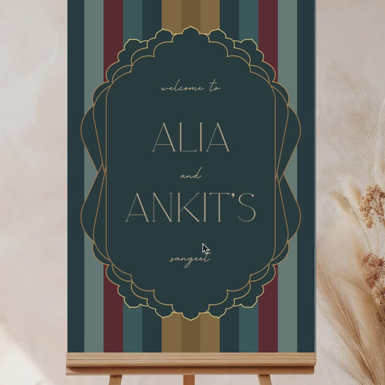 Are you planning a wedding event and want to add your own personal touch? Our stationery designs are perfect for the DIY enthusiast. This modern striped welcome sign is the perfect fit for any type of event or theme. It's inspired by Sabyasachi's rich colours & bold combinations. Although the background artwork cannot be edited, due to artist Copyright, all text (and its colours) can be customized to your preference. Save time and money without compromising on quality or style by bundling your stationery.