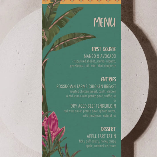 Are you planning a wedding event or any other special celebration and want to add your own personal touch? Our stationery designs are perfect for the DIY enthusiast. This modern tropical/jungle menu is the perfect fit for any type of event with bold colours to compliment. This design is mostly editable (except for the artwork due to artist copyright) and all text (and its colours) as well as the background elements can be customized to your preference. Save time and money without compromising on quality or style by bundling your stationery.